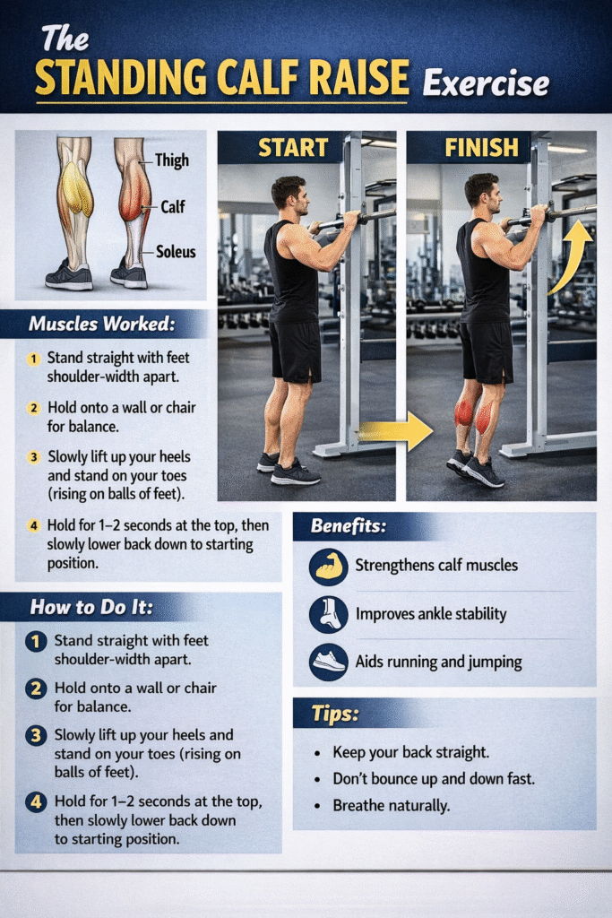 The standing calf raise is a lower-body exercise that mainly targets the calf muscles (Gastrocnemius and Soleus). In this exercise, you lift your heels off the ground and balance on your toes.