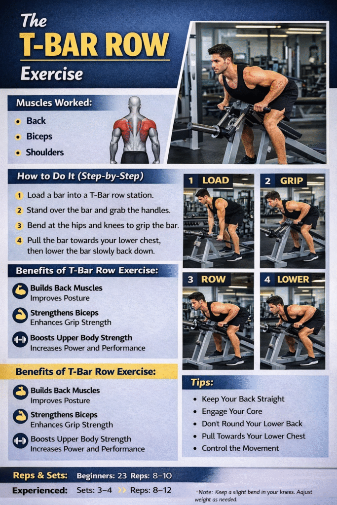 The T-Bar Row is one of the best exercises for building a strong, thick back. When performed with proper form and consistency, it significantly improves strength, posture, and overall upper-body development. Add it to your back workout routine for maximum results.