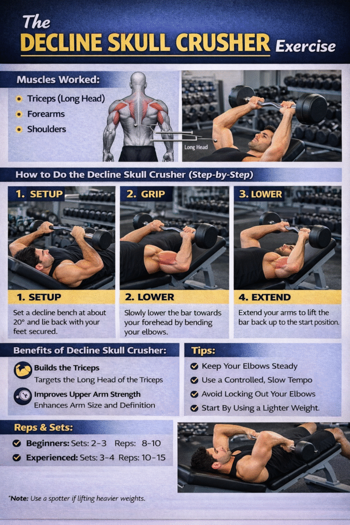 The Decline Skull Crusher is a powerful exercise for developing bigger and stronger triceps. With proper form and consistent training, it can significantly improve arm strength and muscle definition. Add this exercise to your triceps or push-day workout routine for best results.